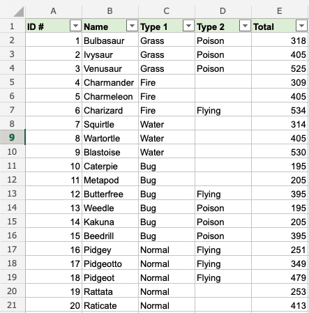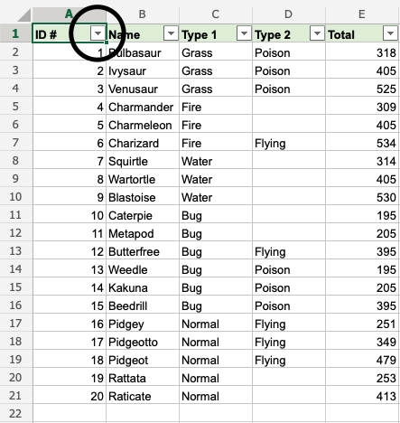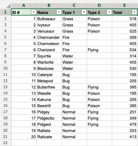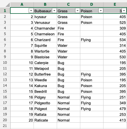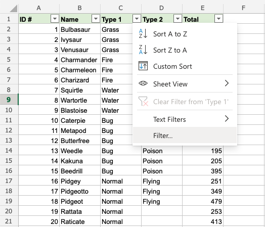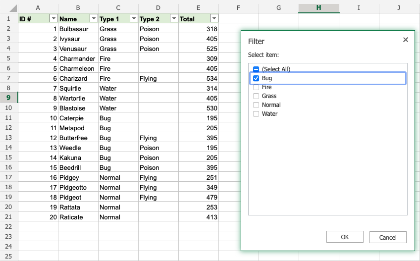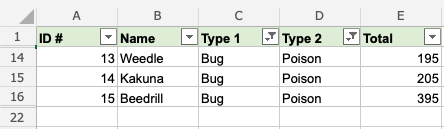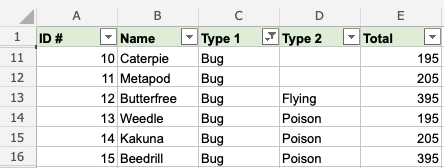 That is on point! We have sorted the range based on Type 1, Bug and Type 2, Poison. The filter option is helpful to make ranges easier to analyse.