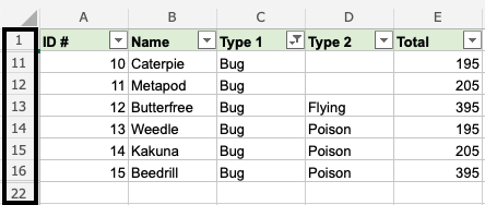 Good job! The range was successfully sorted by Type 1, Bug. All shown Pokemons are Bug type.
